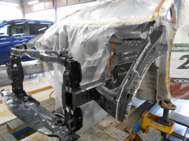 フレーム修正機に車体を固定して